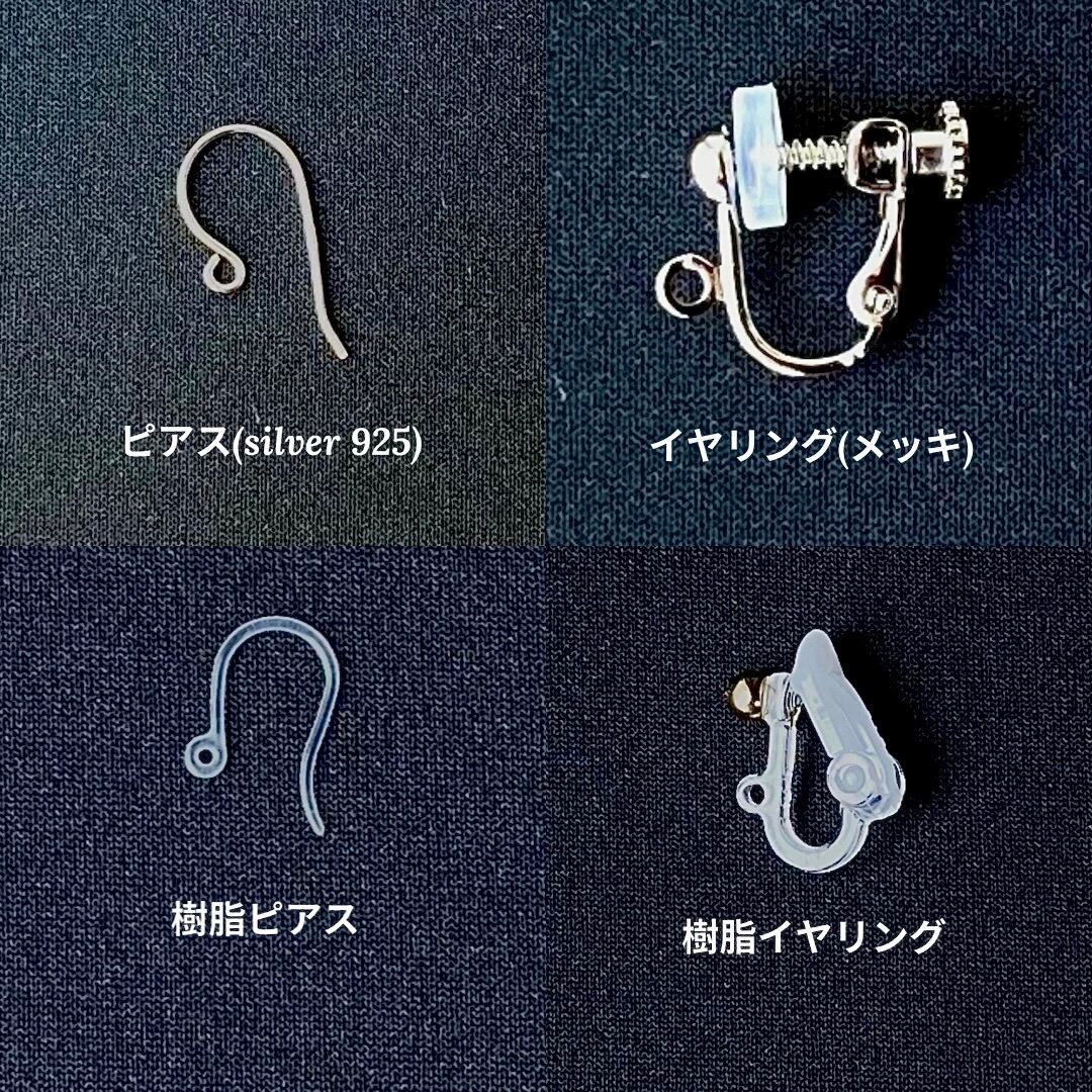 ピアス(silver925)、イヤリング(メッキ)、樹脂ピアス、樹脂イヤリング(+200円)を選べます。